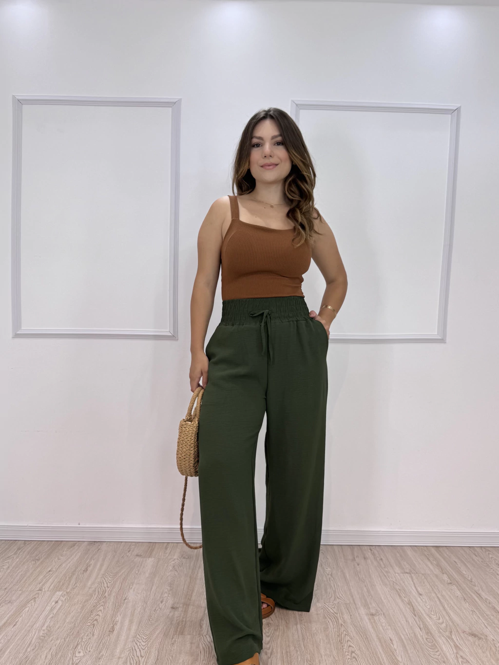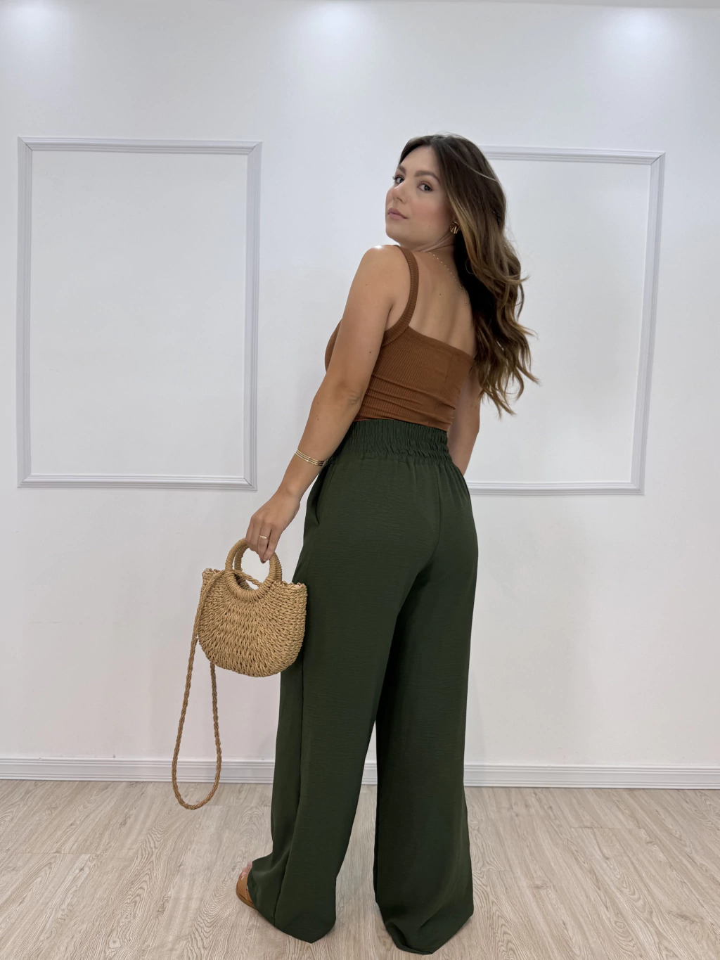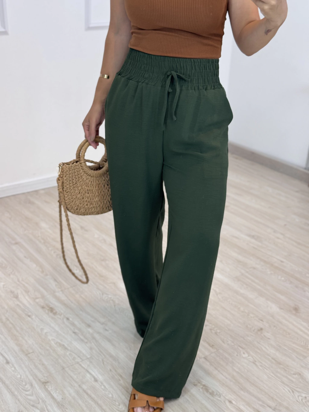 Uma calça necessária para quem não abre mão de conforto, perfeita para usar em dias de calor por ser confeccionada em um tecido fresco e harmônico.