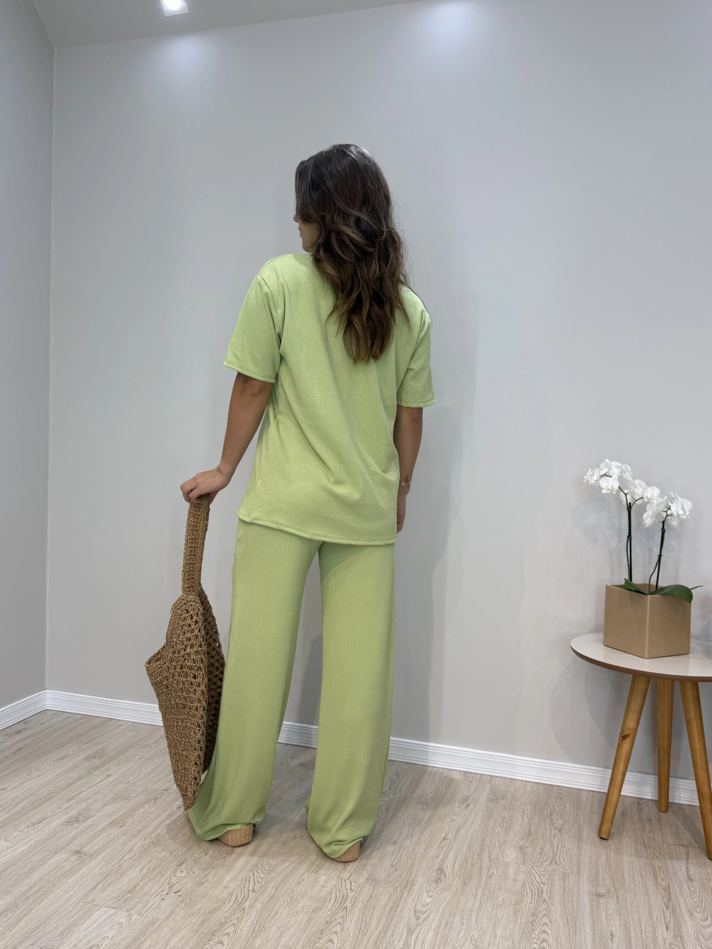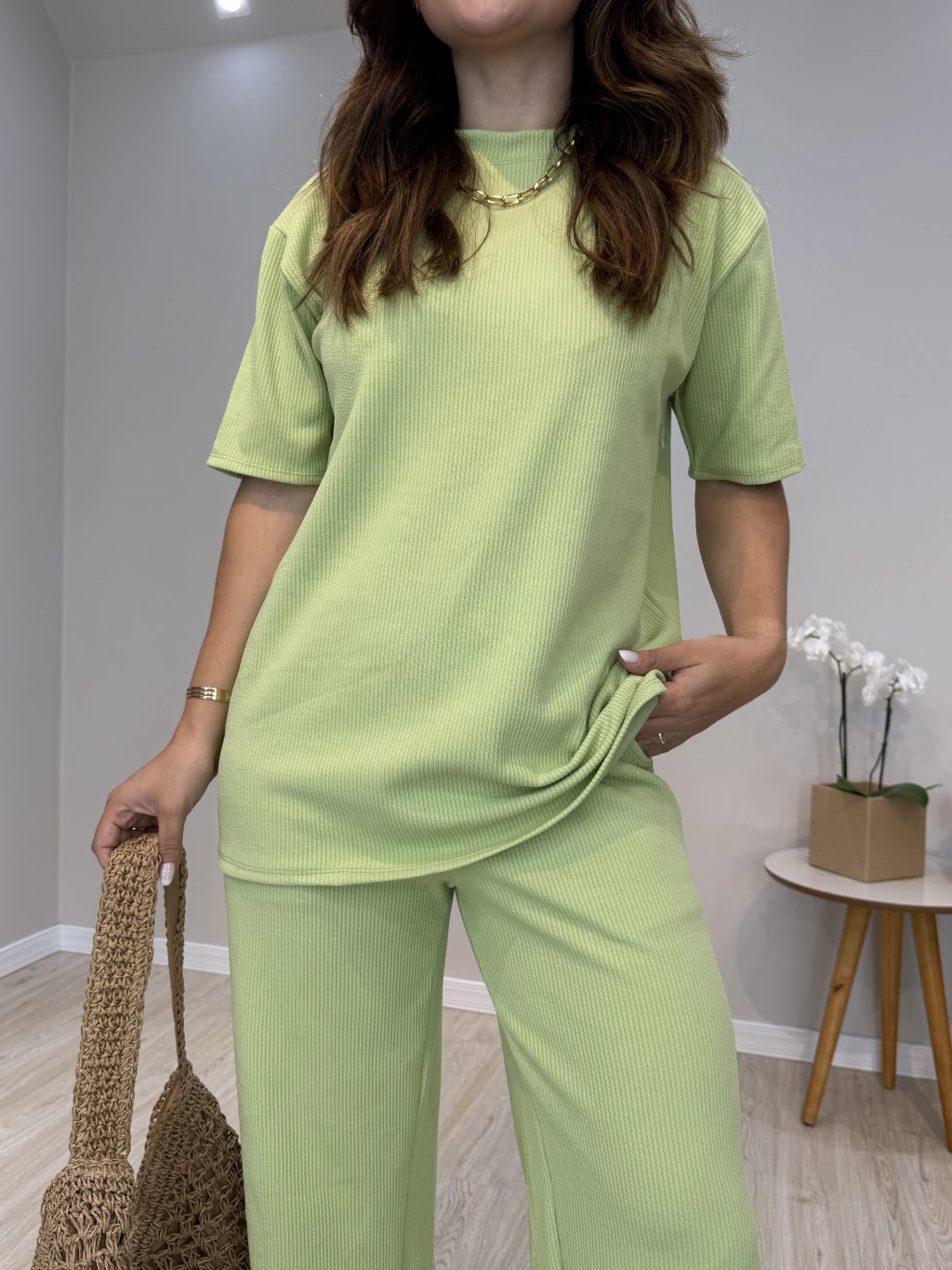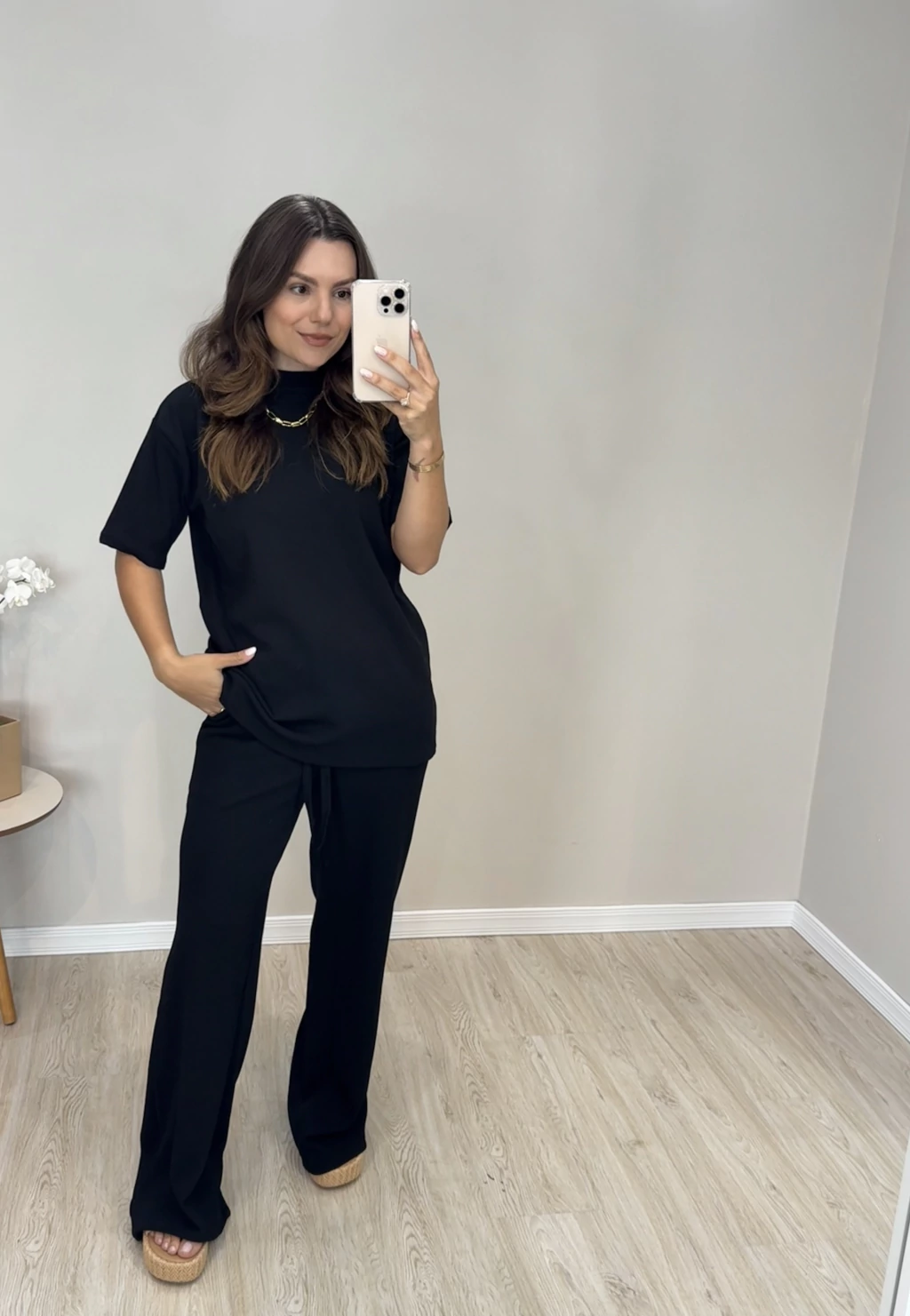 A calça possuí bolsos frontais e cós alto, já na blusa um corte alongado que deixa a peça um charme.
