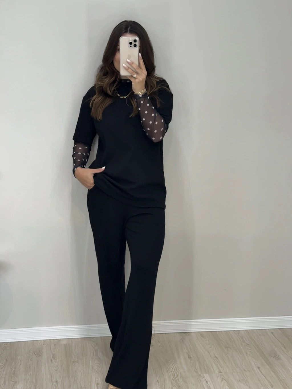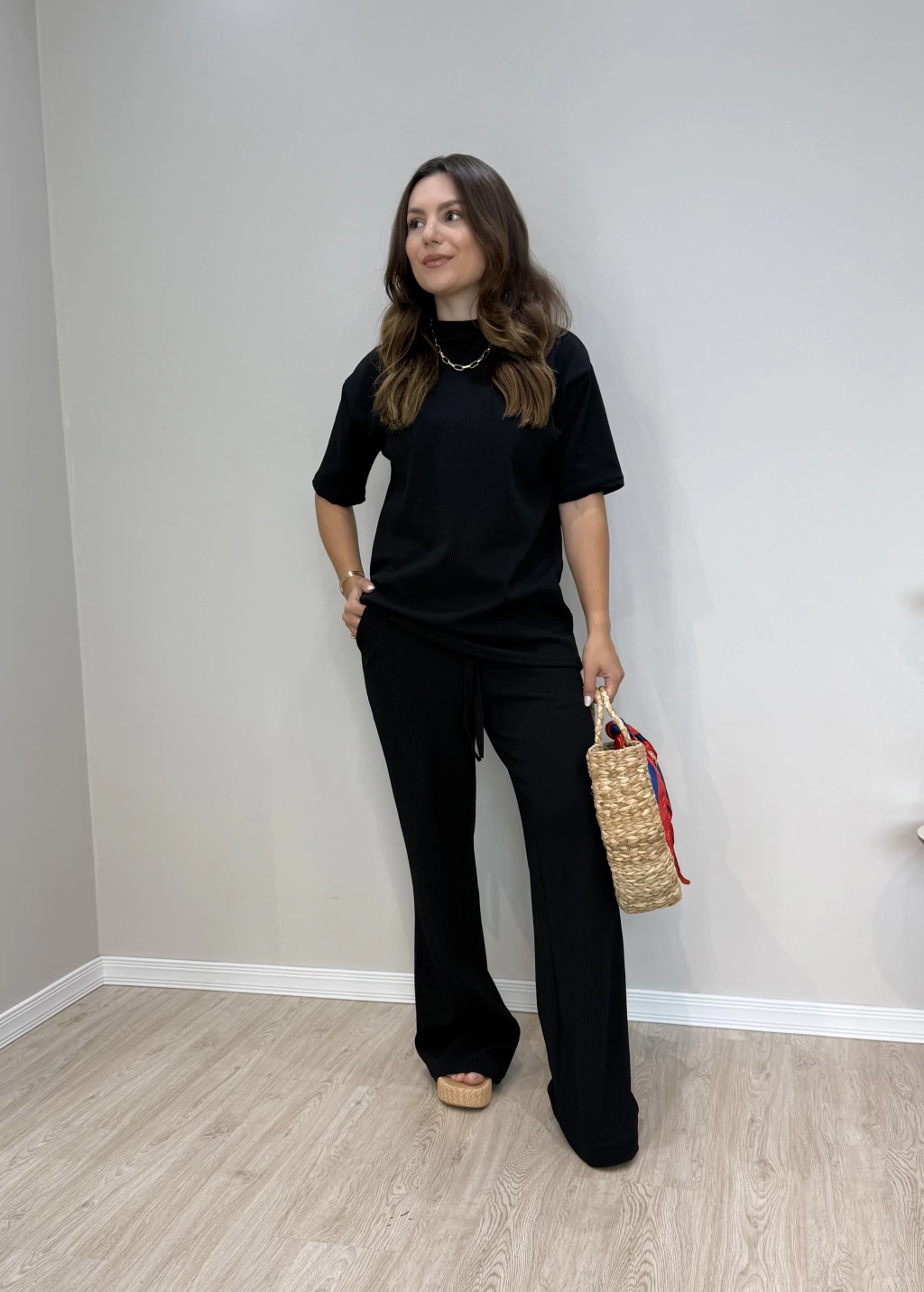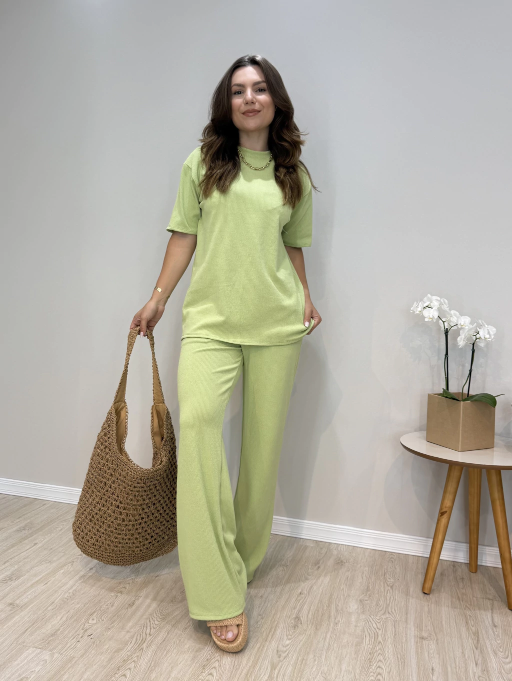A calça possuí bolsos frontais e cós alto, já na blusa um corte alongado que deixa a peça um charme.